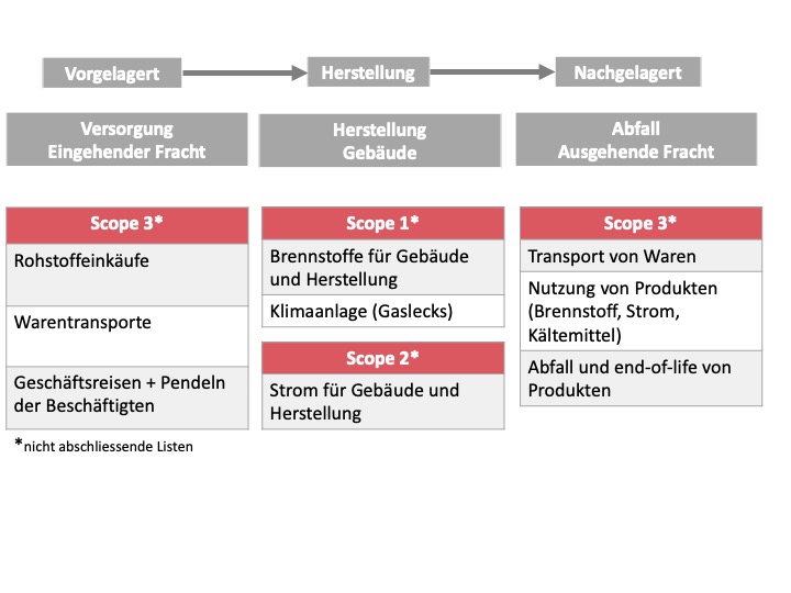 - in den der Produktion / Dienstleistung nachgelagerten Bereichen: z. B. Transport der fertigen Produkte zu den Kunden oder Verbrauchern, Nutzung der Produkte/Dienstleistungen, Abfall am Ende der Lebensdauer der Produkte.