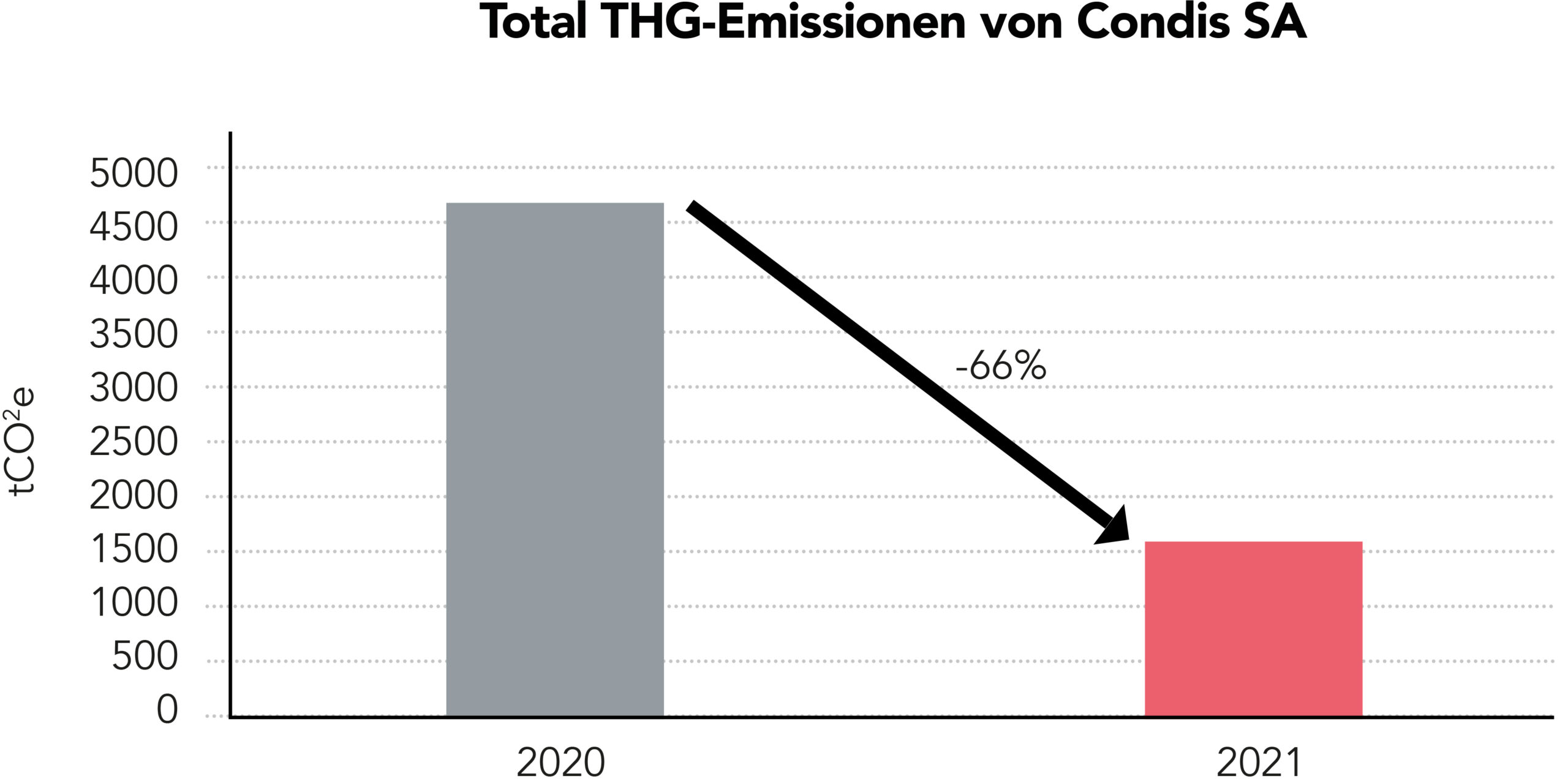 Der CO2-Fussabdruck der Condis AG, der für die Jahre 2019 und 2020 im Rahmen des ESG-Programms der Renaissance Anlagestiftung berechnet wurde, ergab einen Rückgang des CO2-Ausstosses um 66%.