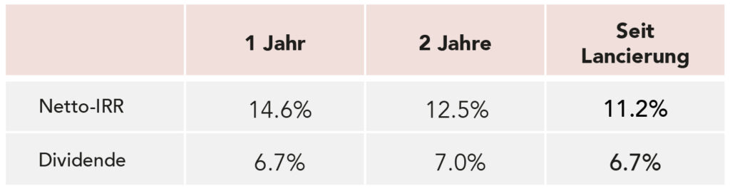 Die Performance von RENAISSANCE EVERGREEN hält per 31. März 2024 mit einem Netto-IRR von 14.6% für die letzten zwölf Monate und 11.2% seit der Lancierung der Anlagegruppe im Jahr 2019 an. Die jährliche Dividende beträgt 6.7% für die letzten 12 Monate und 6.7% seit der Lancierung.