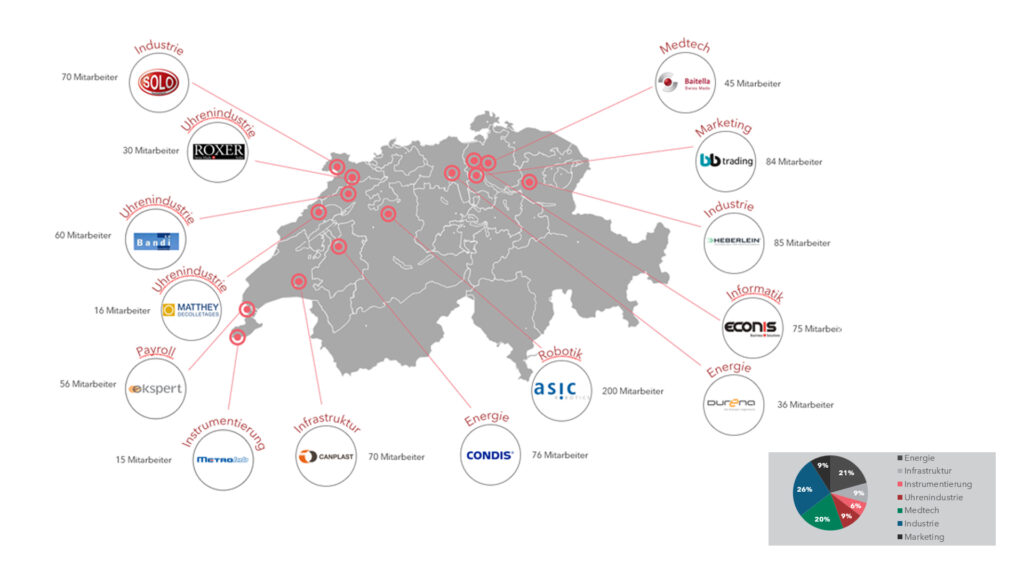 Das Portfolio ist äusserst diversifiziert: Uhrenindustrie, Wassermanagement/Infrastruktur, MedTech, Energie, Robotik, Industrie und Marketing. Wir entwickeln gezielt ein branchenübergreifendes Portfolio, um die notwendige Diversifikation zu erreichen und eine Überbelastung in einem Sektor zu vermeiden. Es handelt sich um mittelständische Unternehmen, die in der Regel zwischen 50 und 100 Mitarbeiter beschäftigen.