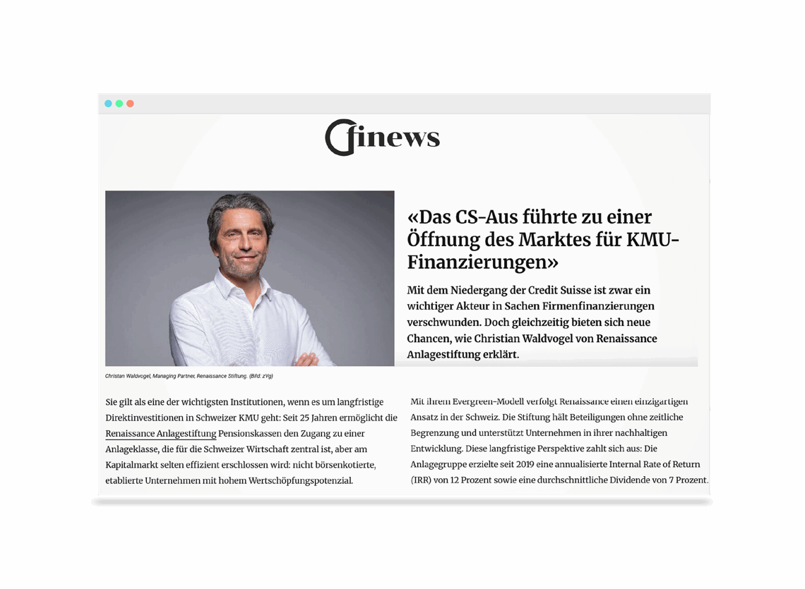 Finews.ch widmet Renaissance einen Artikel mit einem Interview mit Christian Waldvogel, Managing Partner, und hebt die Solidität unseres Evergreen-Modells hervor.