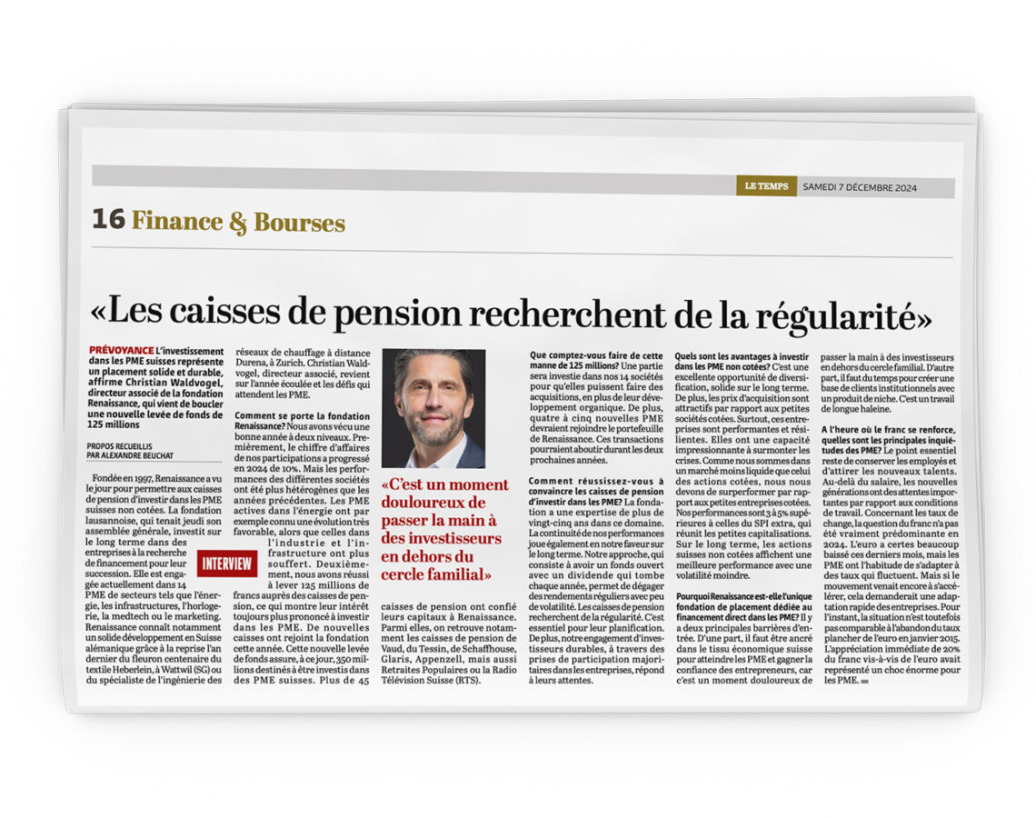 In ihrer Ausgabe vom 7. Dezember veröffentlichte Le Temps ein Interview mit Christian Waldvogel, Managing Partner von Renaissance, um das zunehmende Interesse von Pensionskassen an Investitionen in Schweizer KMU zu thematisieren.
