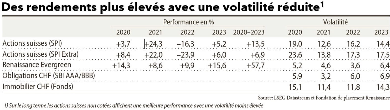 Le graphique ci-après résume les performances et la volatilité réduite de Renaissance Evergreen par rapport aux actions suisses cotées, comme le relève Finanz & Wirschaft dans son article du 7 septembre dernier: « Les sociétés cotées en Bourse suisse ne sont pas les seules à mériter une attention particulière ». Le texte revient sur l’atout principal de ce type de placements, à savoir que les entreprises suisses sont profitables et résilientes, avec un avantage sur le prix d’acquisition des entreprises non cotées. À l’image des placements immobiliers dont ont l’habitude les caisses de pension, investir dans des PME suisses non cotées s’impose de plus en plus comme une évidence en termes de diversification de placements, donnant ainsi l’accès à des secteurs qui ne sont souvent pas représentés dans des marchés publics. Dans ce contexte, les véhicules de placement développés ces dernières années par Renaissance, et son fonds «Evergreen» en particulier, constituent une excellente opportunité de diversification, solide dans le long terme.